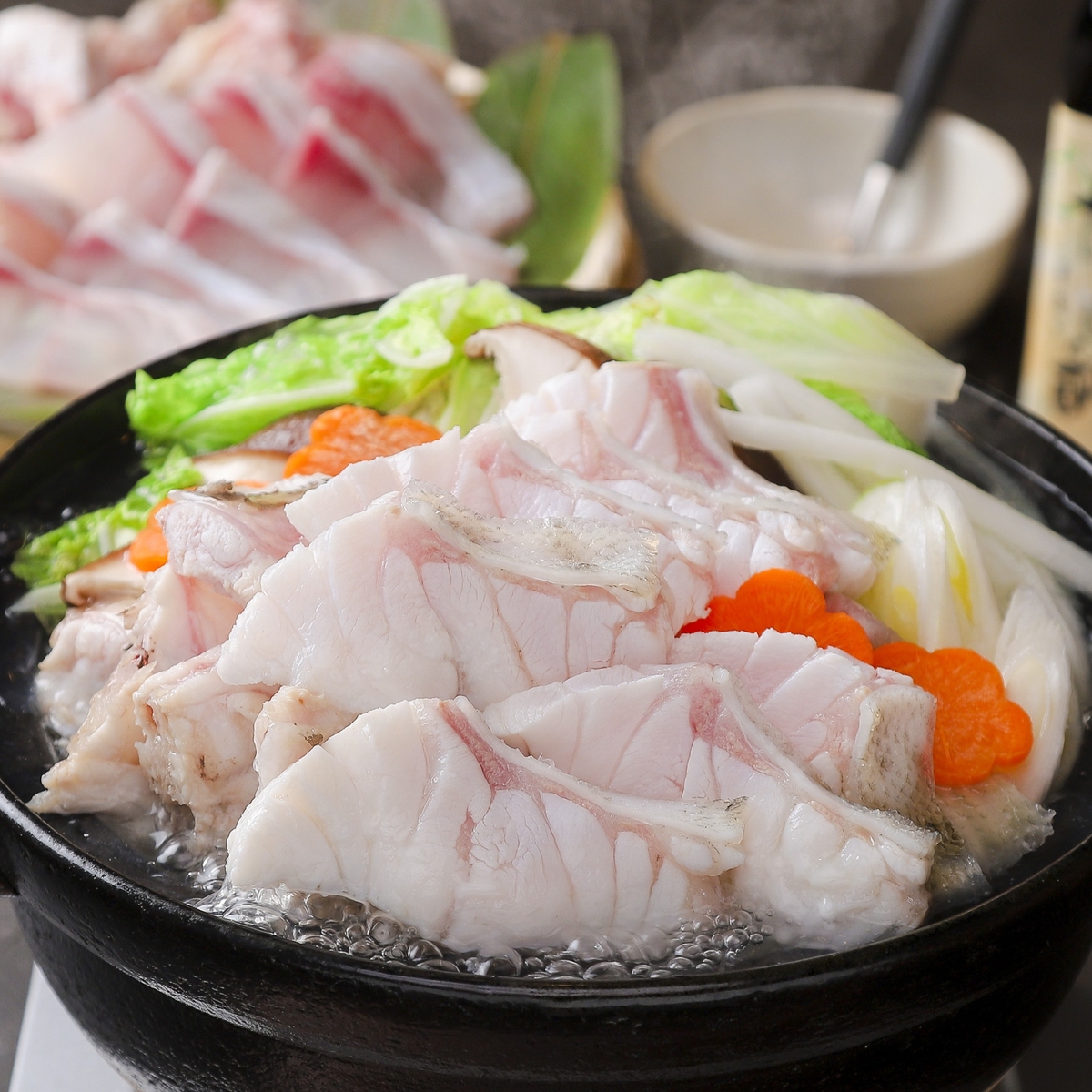 近畿大学水産研究所では昭和63年(1988年)、“幻の高級魚”と称されるクエの人工ふ化・飼育に成功。現在も各方面で好評を博しています。一方で、クエは成長が遅いことから養殖期間が長くなることが課題でした。平成23年(2011年)、同じハタ科で成長が早い南方系の「タマカイ」と交配させる交雑魚「クエタマ」の作出に成功しました。クエよりも成長が良く、身質も良好で高い評価を得ています。身はクエのような淡泊で上品な味わい。クエと同様に鍋料理が一番のおすすめですが、塩焼き・唐揚げ等どんな料理にでも合う万能な魚です。近畿大学の研究の成果である「クエタマ」を是非この機会にご堪能ください。
